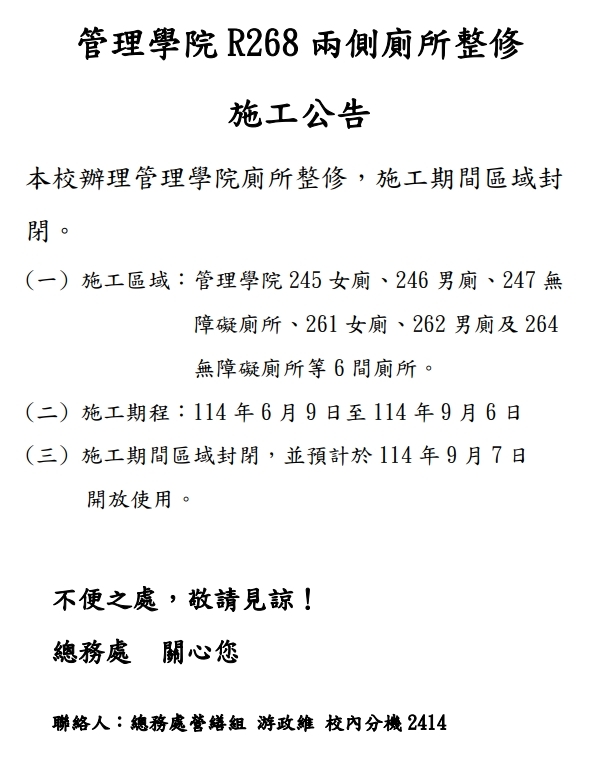 【施工通知】管理學院R268兩側廁所整修